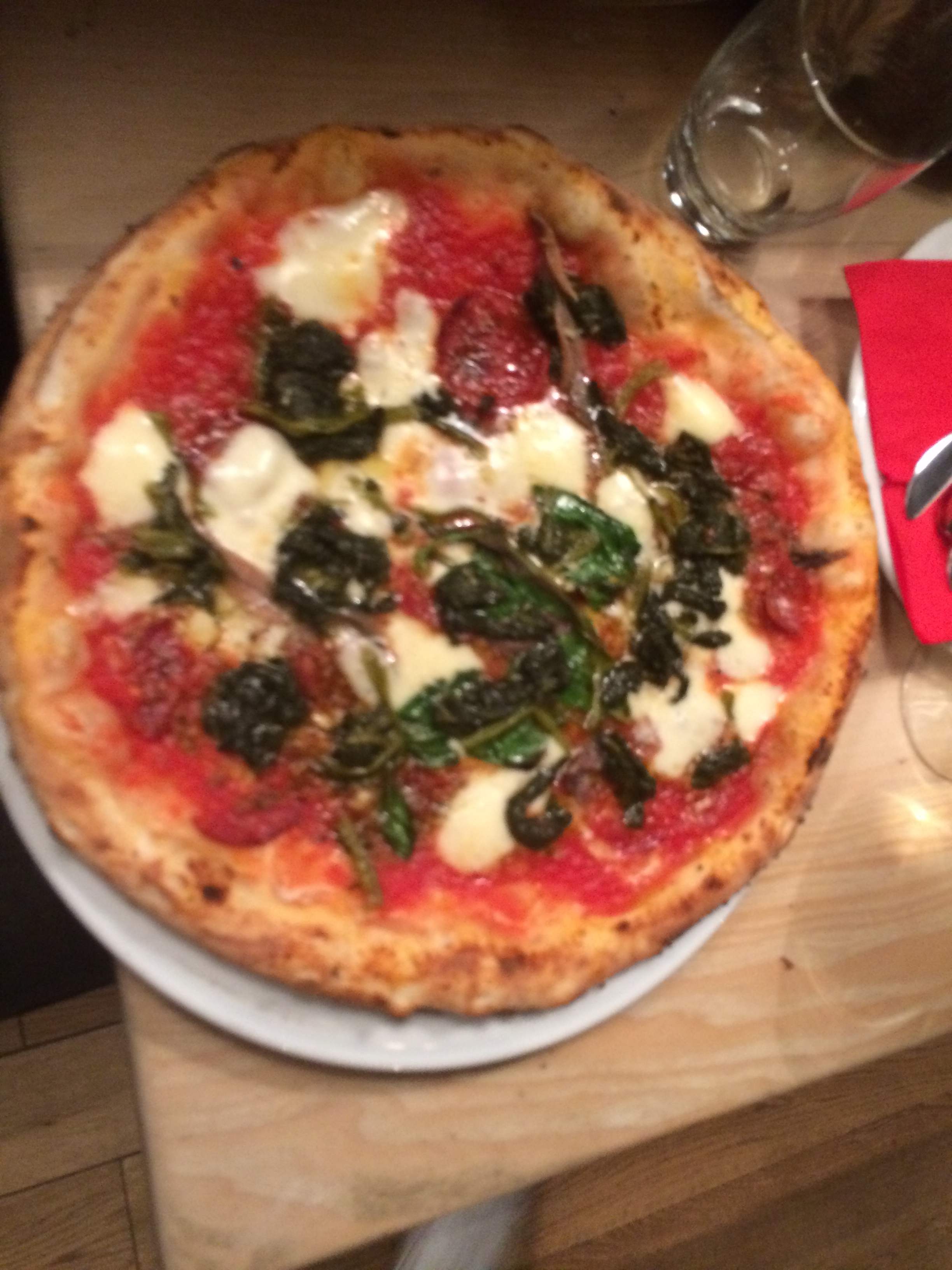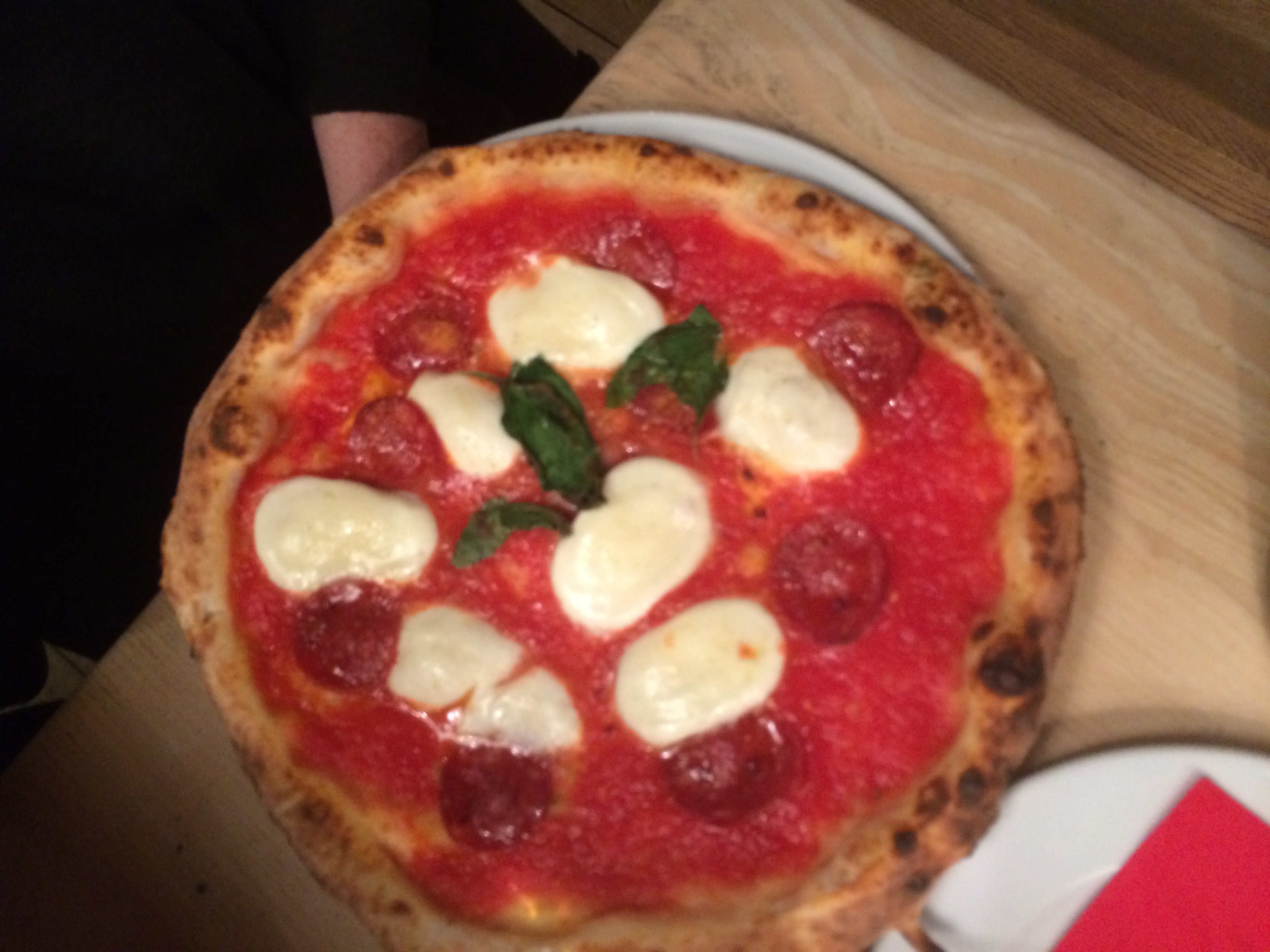 I couldn’t resist giving this one a go, but for non beetroot fans don’t worry the other pizzas are a normal sourdough. The pizza you see pictured is topped with Onion marmalade, goats cheese, with drops of beetroot puree a drizzle of balsamic reduction and baby leaves. The texture of the dough was good, with a nice chew to the crust and the smokiness that comes from a pile of burning wood next to the pizza.